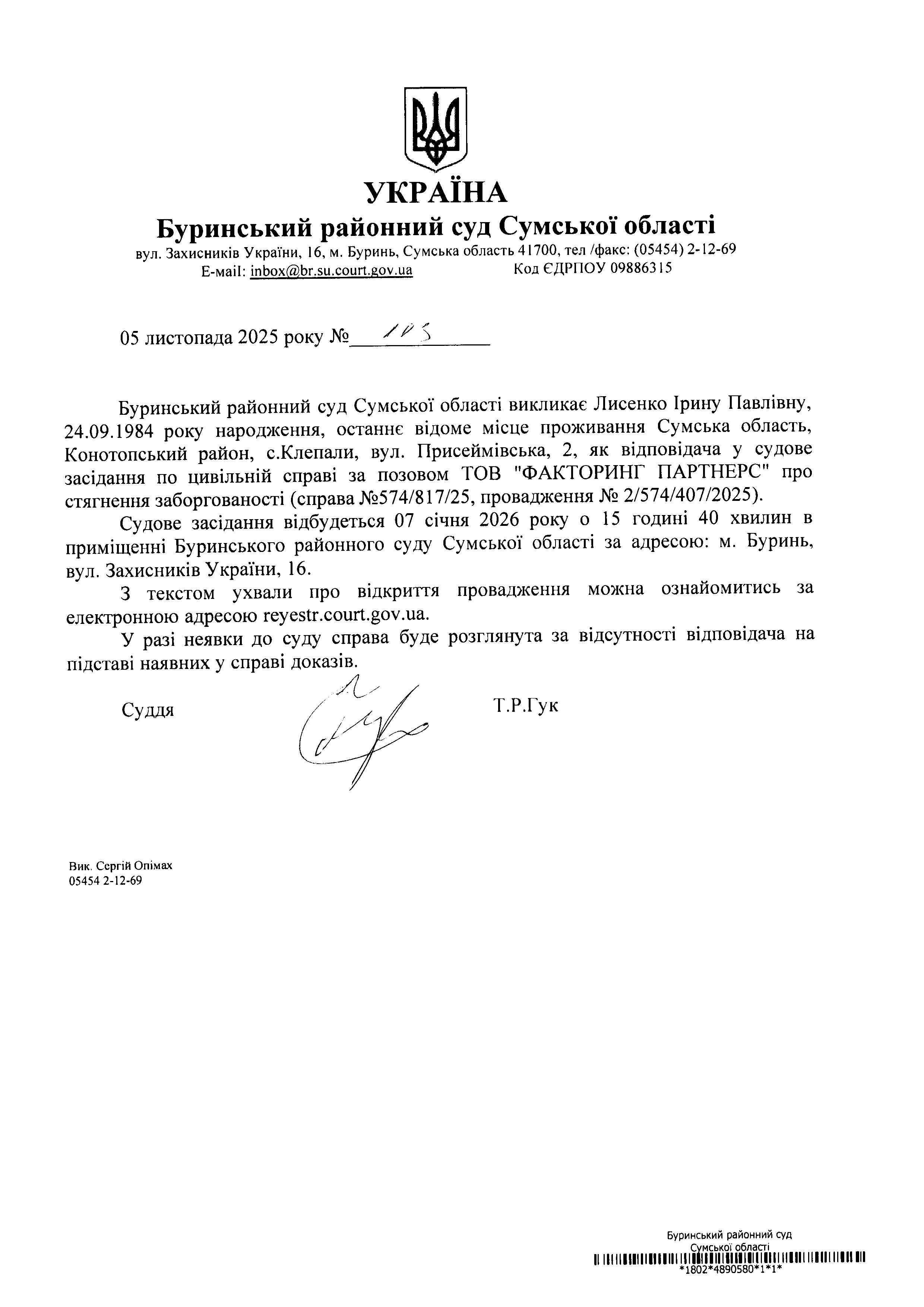 Буринський районний суд Сумської області викликає Лисенко Ірину Павлівну