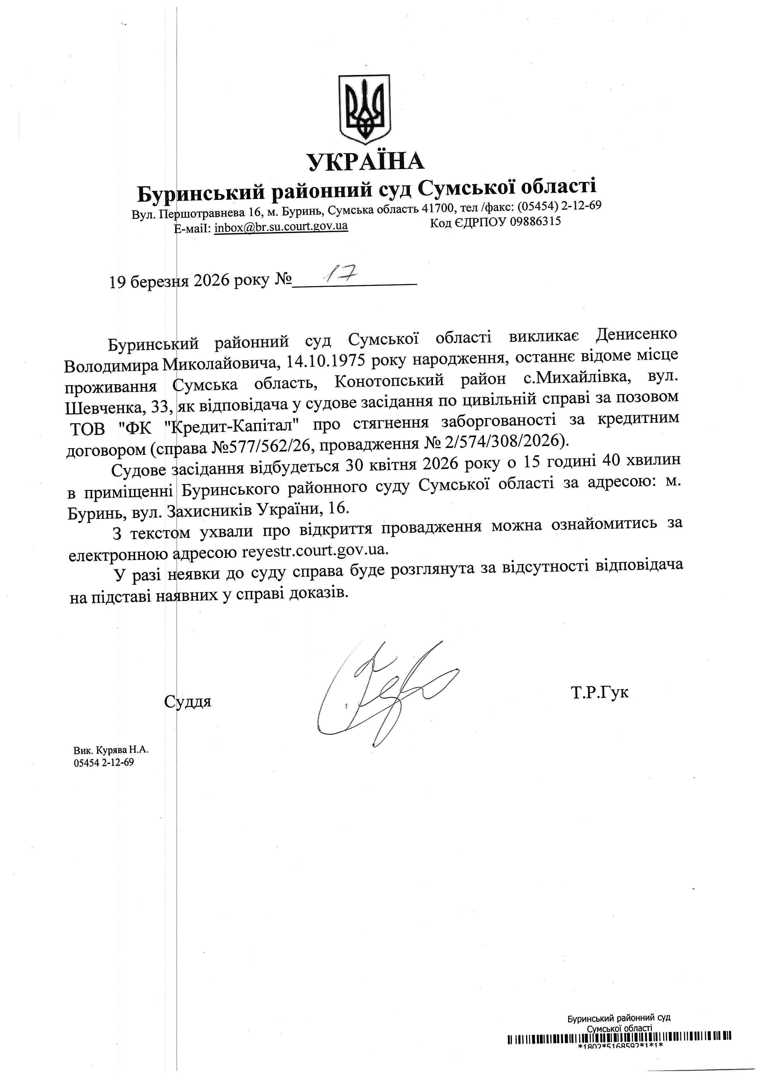 Буринський районний суд Сумської області викликаєДенисенко Володимира Миколайовича