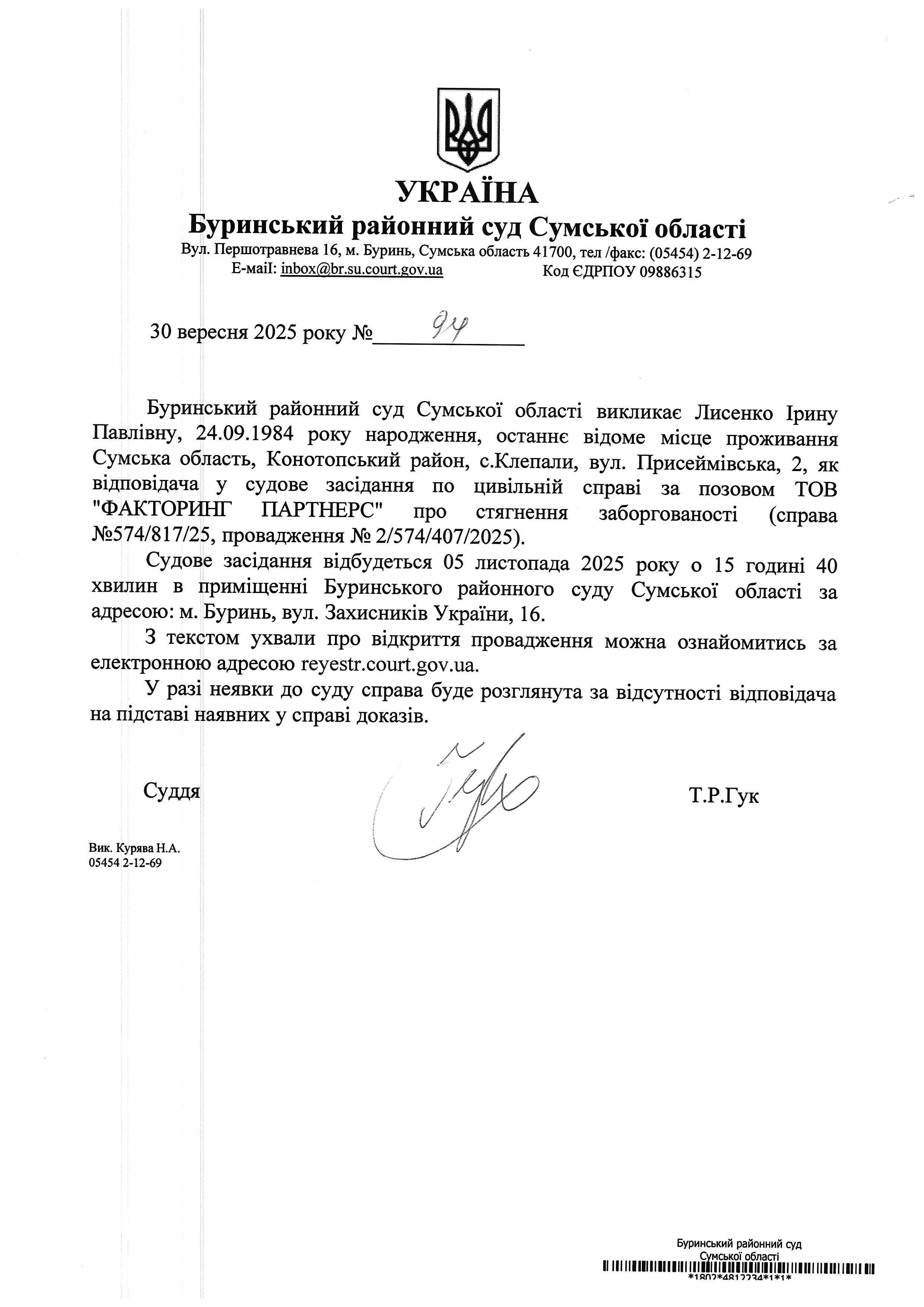 Буринський районний суд Сумської області викликає Лисенко Ірину Павлівну