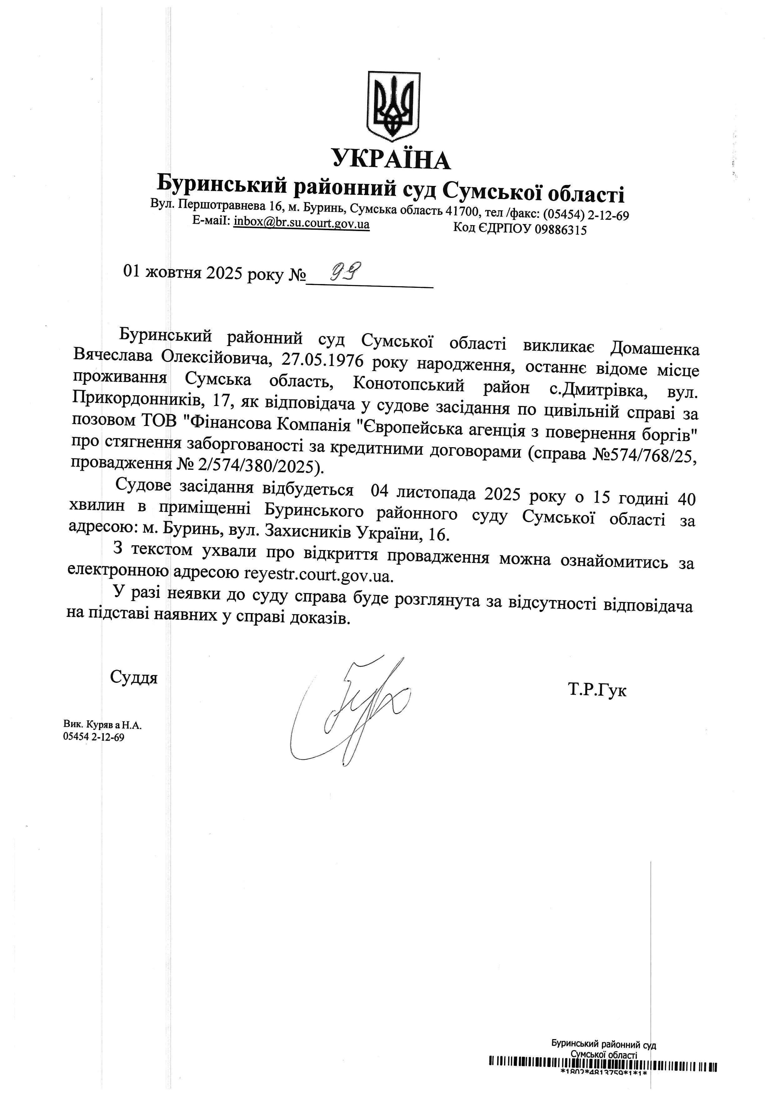 Буринський районний суд Сумської області викликає Домашенка Вячеслава Олексійовича